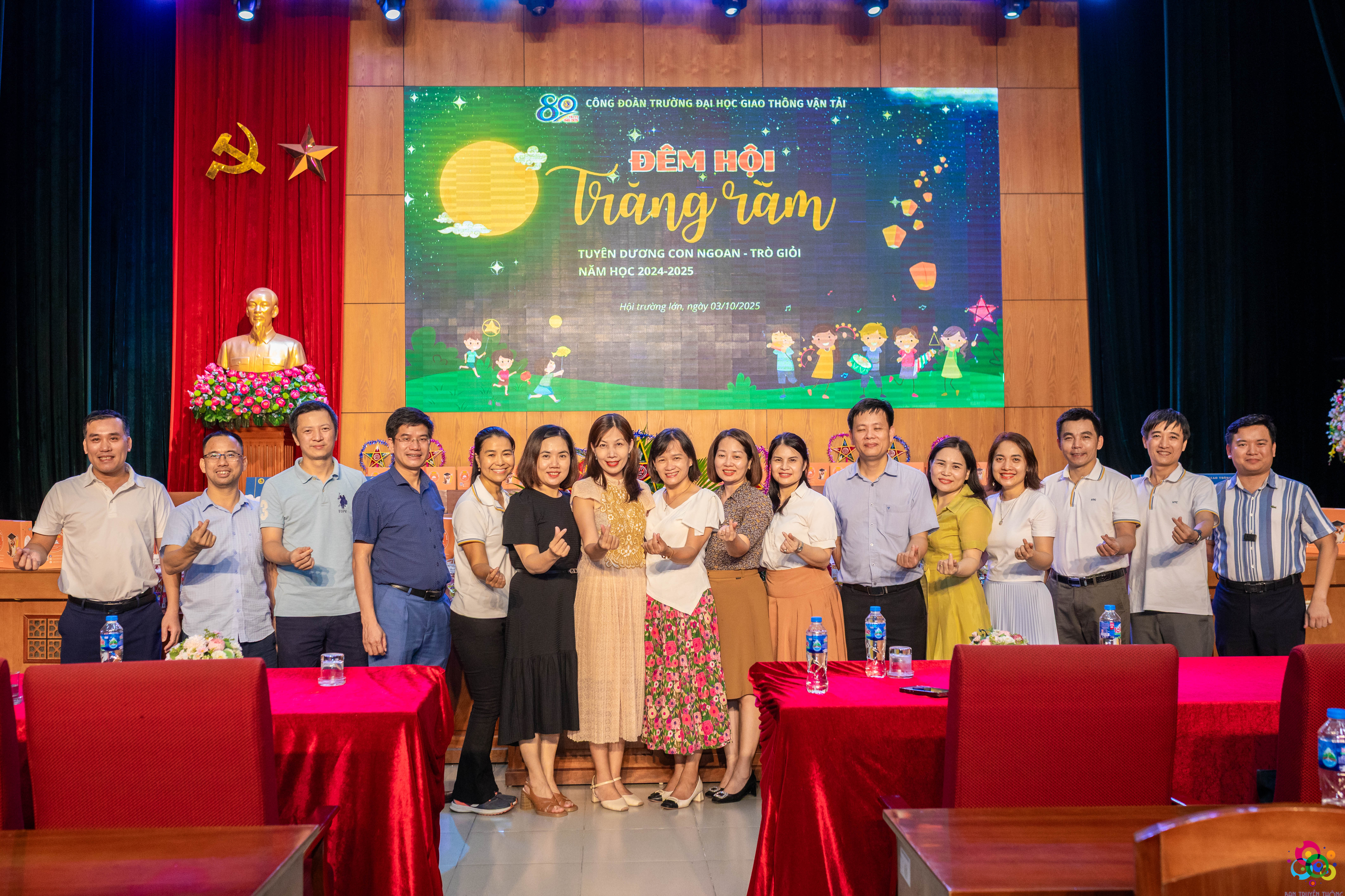 Vào 18h30 thứ sáu ngày 03 tháng 10 năm 2025, tại Nhà văn hóa, BCH Công đoàn Trường ĐHGTVT đã tiến hành tổ chức chương trình “Con ngoan – Trò giỏi” năm học 2024-2025 và Tết trung thu cho các con CB-NG-NLĐ Trường. Đây là hoạt động nhằm tuyên dương thành tích học tập dành cho con CB-NG-NLĐ (đạt danh hiệu học sinh giỏi, đạt giải trong các cuộc thi Olympic, kỳ thi cấp Quận (Huyện) trở lên. Cùng với đó là hoạt động “Lễ hội trung thu” cho toàn thể các con của CB-NG-NLĐ trong toàn trường. Tới dự chương trình có PGS.TS. Lê Hoài Đức, Phó HT; Ths. Nguyễn Văn Khởi, Bí thư ĐNTCSHCM trường; Ths. Phạm Tiến Dũng CT CĐ trường và các đồng chí trong BTV, BCH CĐ trường. Chương trình còn có sự tham gia đông đảo của các các con CB-NG-NLĐ trong toàn trường.
