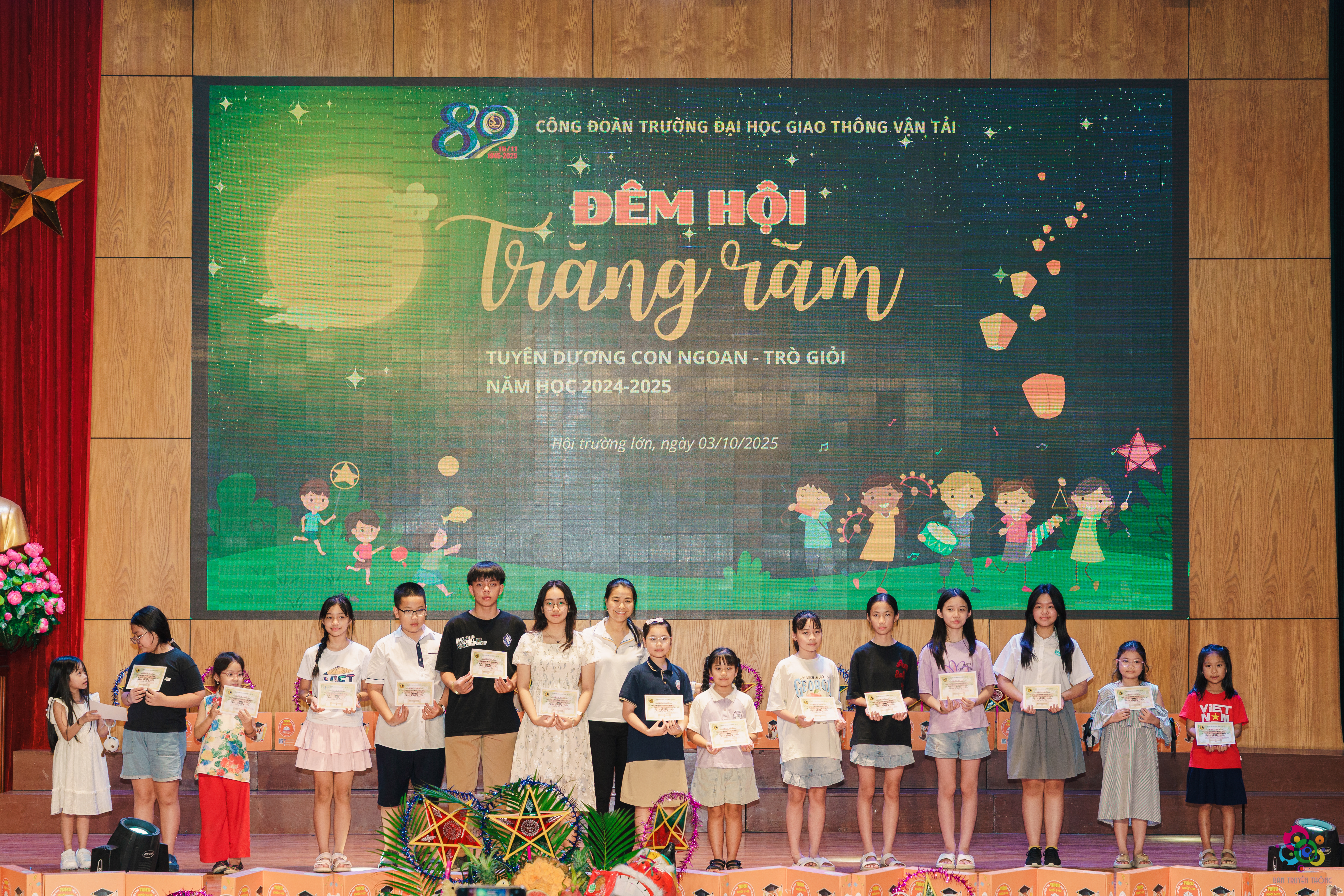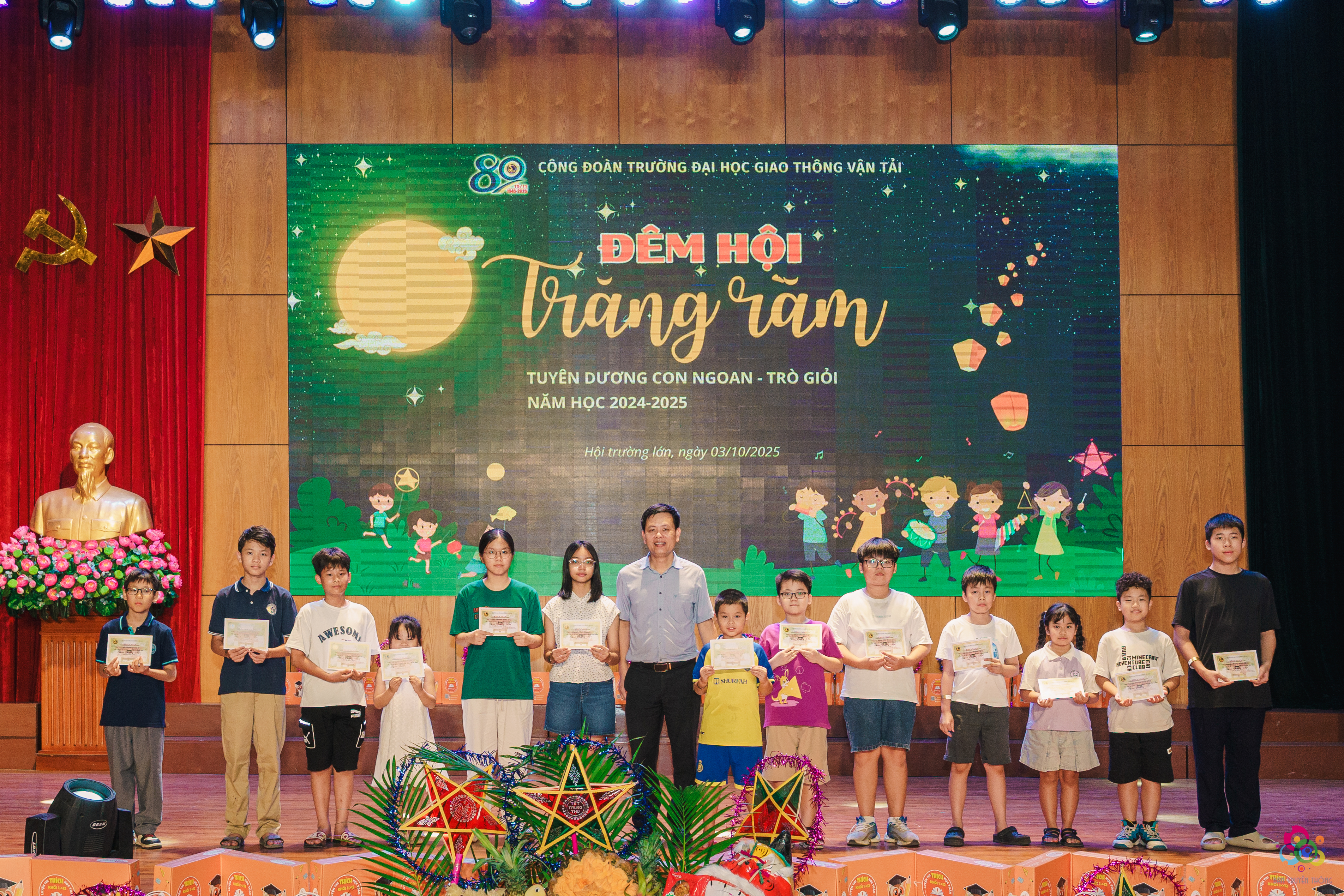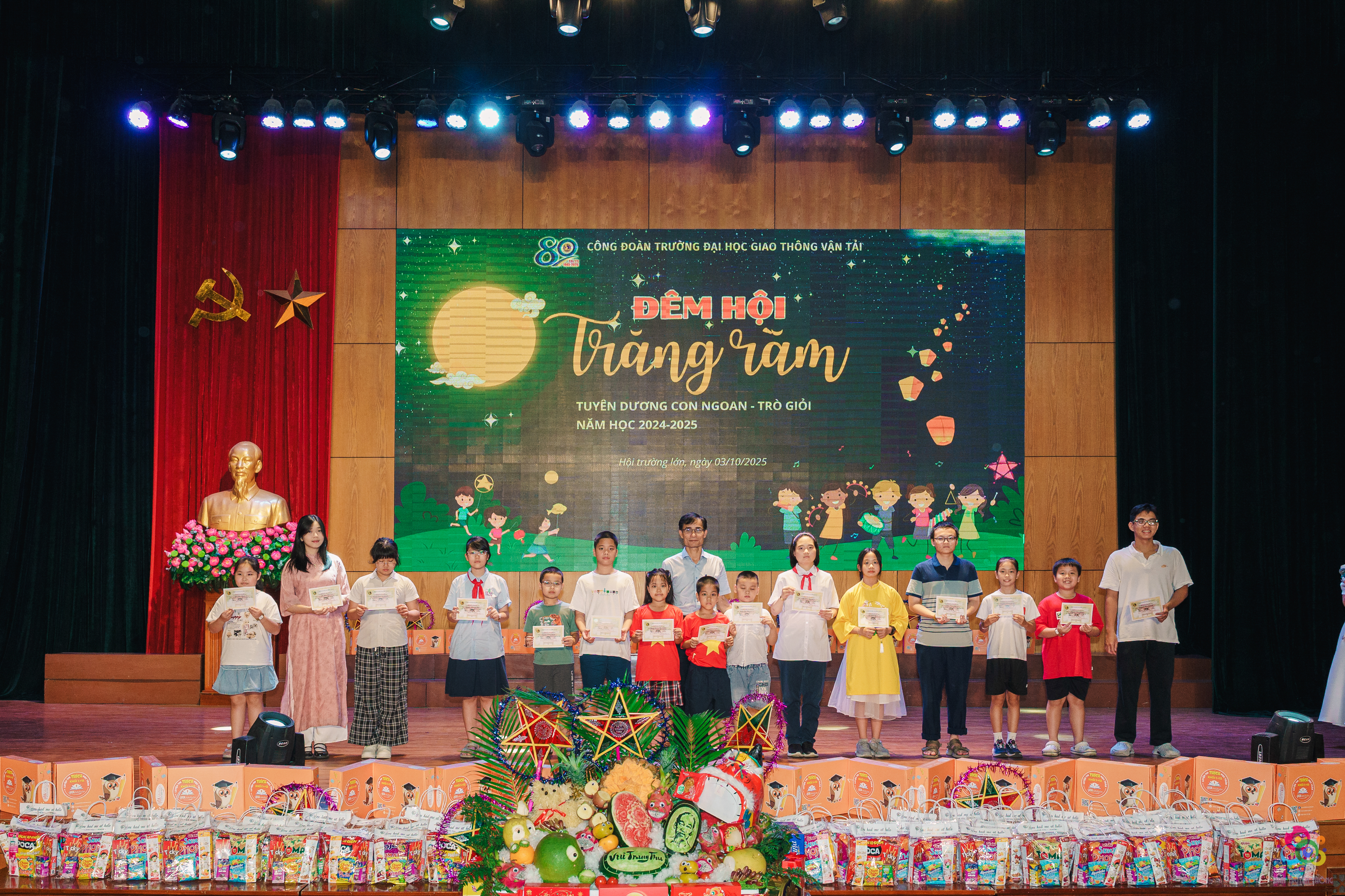 Tối thứ sáu ngày 03 tháng 10 năm 2025 (ngày12/8/2025 âm lịch), tại Nhà văn hóa, BCH Công đoàn Trường ĐHGTVT đã tiến hành tổ chức chương trình “Con ngoan – Trò giỏi” năm học 2024-2025 và Tết trung thu cho các con CB-NG-NLĐ Trường. Đây là hoạt động nhằm tuyên dương thành tích học tập dành cho con CB-NG-NLĐ (đạt danh hiệu học sinh giỏi, đạt giải trong các cuộc thi Olympic, kỳ thi cấp Quận (Huyện) trở lên. Cùng với đó là hoạt động “Lễ hội trung thu” cho toàn thể các con của CB-NG-NLĐ trong toàn trường. Tới dự chương trình có PGS.TS. Lê Hoài Đức, Phó HT; Ths. Phạm Tiến Dũng CT CĐ trường và các đồng chí trong BTV, BCH CĐ trường. Chương trình còn có sự tham gia đông đảo của các các con CB-NG-NLĐ trong toàn trường.
